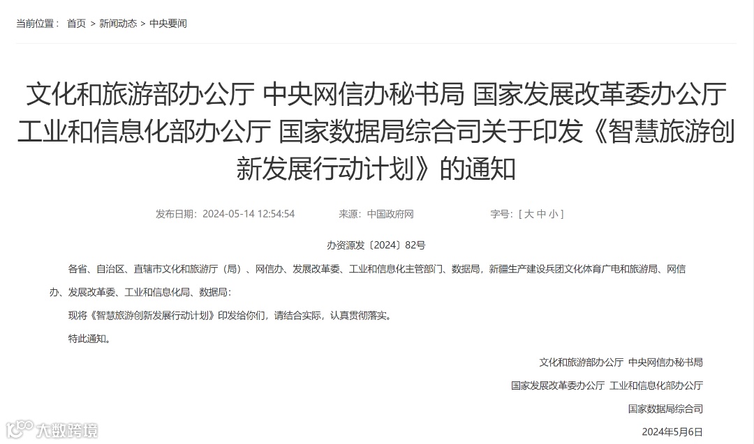 近日,文化和旅游部办公厅、中央网信办秘书局、国家发展改革委办公厅、工业和信息化部办公厅、国家数据局综合司联合印发《智慧旅游创新发展行动计划》,明确提出加强“5G+智慧旅游”协同创新,推动数字经济与旅游业深度融合,加快以数字化、网络化、智能化为特征的智慧旅游发展。