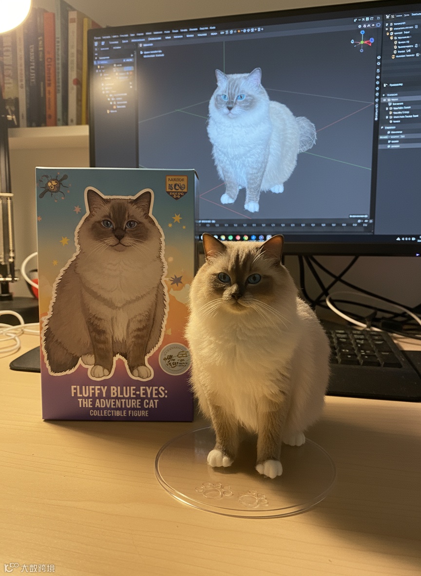 将图片转化为角色手办,背后放置印有角色形象的包装盒,盒前设圆形塑料底座,手办立于其上,背景中电脑屏幕显示Blender建模过程,场景建议设于室内。