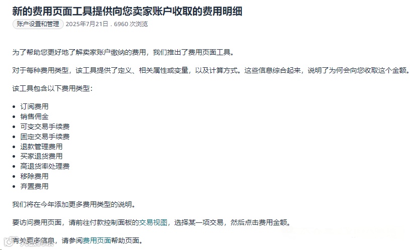 涵盖订阅费、推广佣金、可变/固定成交费、退款处理费、退货费、高退货率处理费、移除费、销毁费等多项常见费用。