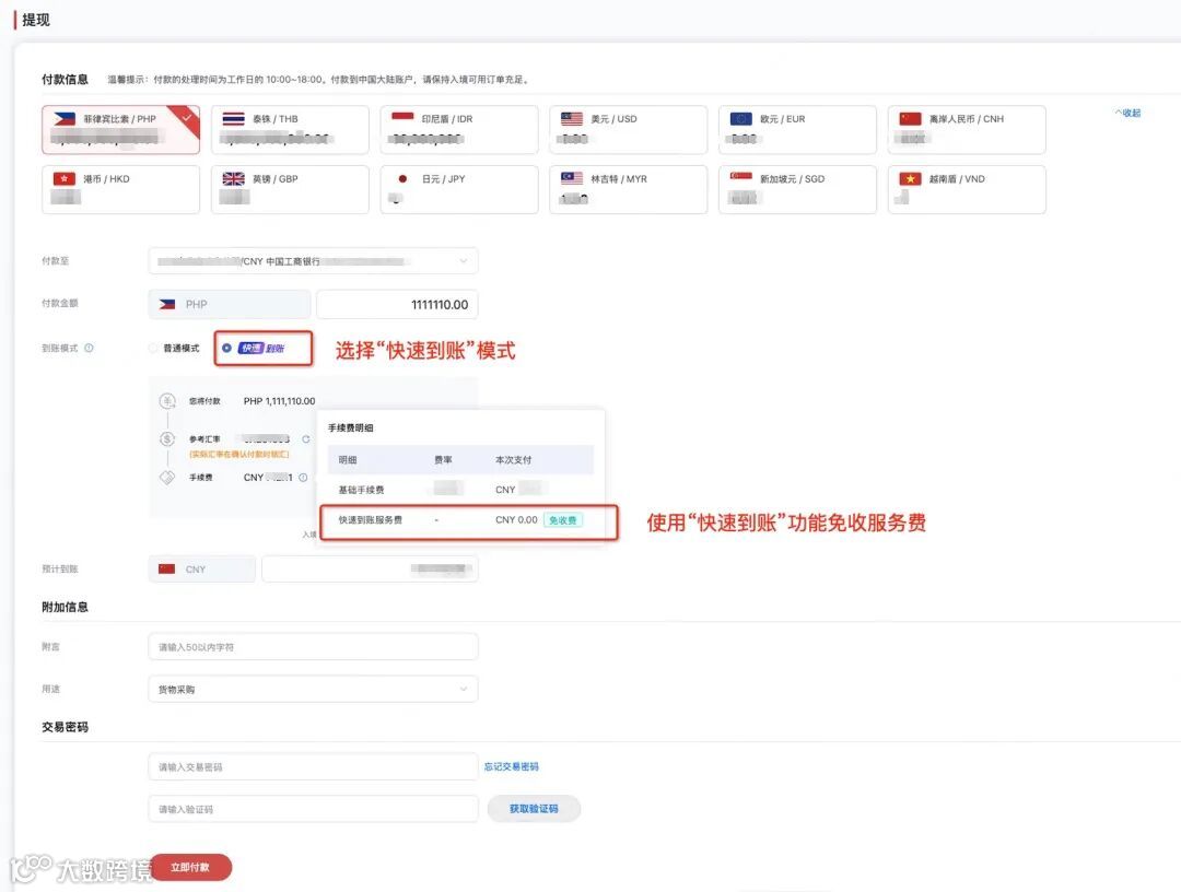 用户在提现时选择“快速到账”模式即可享受该服务,操作便捷,全程无附加费用。