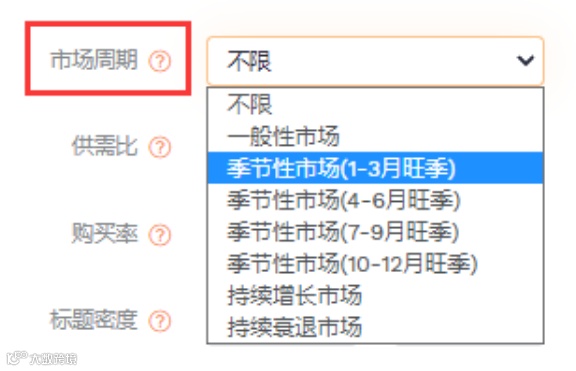 点击市场周期,选择目标销售旺季,再另外叠加上几个其它的过滤条件就能拿到搜索结果。