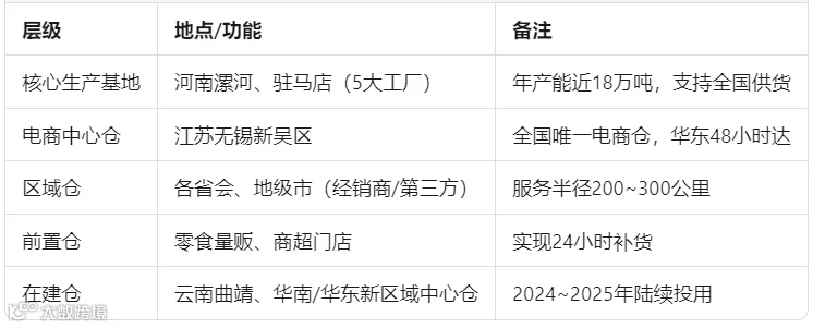物流仓网结构:卫龙美味构建以河南漯河、驻马店为核心生产基地,华东无锡为电商中心仓,全国多点区域仓联动的立体化仓网结构。