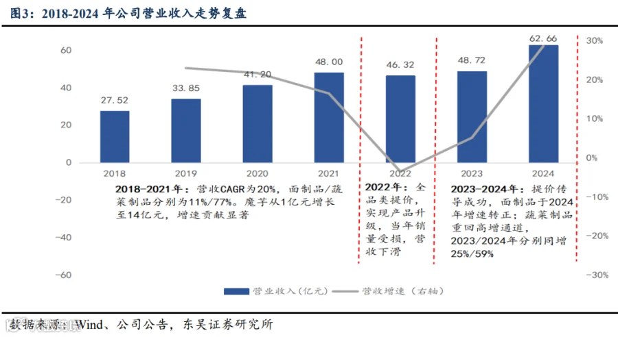 2020 年公司进行渠道改革、拆分事业部并启动合伙人制,后续又调整为辅销、助销 模式;2022 年港股上市,同年全品类提价实现产品升级;2023-2024 年提价顺利传导, 渠道架构进行前期调整后稳定下来,配合魔芋产品的品类趋势,2024 年营收端实现高增。