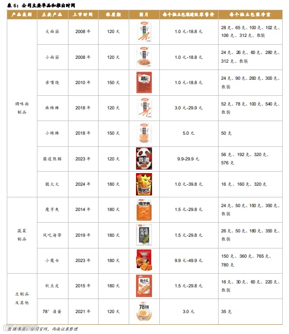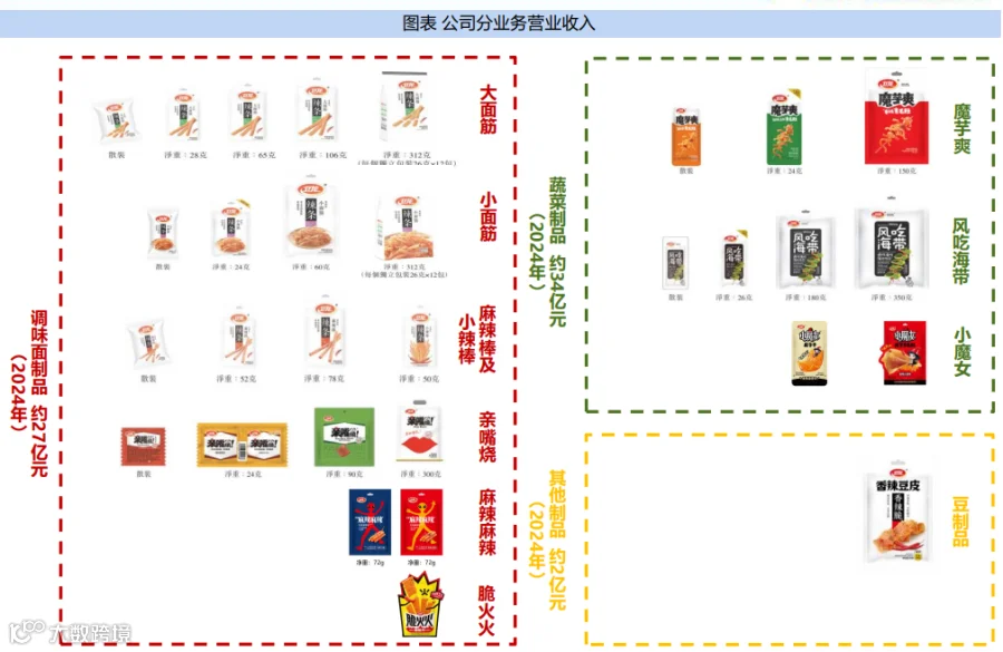 2015年起,公 司将在辣条上积累的调味技 术横向运用至蔬菜制品和豆 制品,推出魔芋爽和软豆皮, 品类由调味面制品开始向其 他品类扩张。此外,调味面 制品(辣条)也延伸出小面 筋、麻辣棒及小辣棒等多种 细分品类,满足多元化需求。