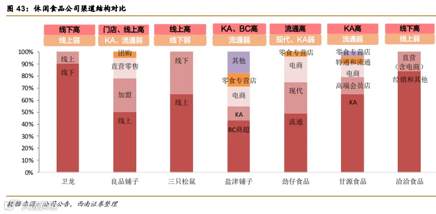 目前公司本身渠道 覆盖率还未达到天花板,仅卫龙与洽洽线下渠道布局广泛。从网点覆盖广度来看,卫龙在零食企业中遥遥领先,但距离优秀快消品公司仍有差距。