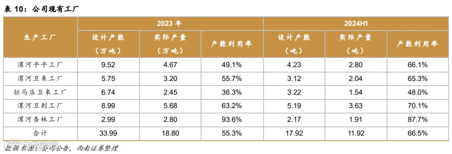 2023 年总设计产能 达 34 万吨;24H1 总设计产能为 17.9 万吨。24H1 漯河平平工厂/漯河卫来工厂/驻马店卫来 工厂/漯河卫到工厂/漯河杏林工厂的产能占比分别为 23.6%/17.4%/18.0%/29.0%/12.1%。