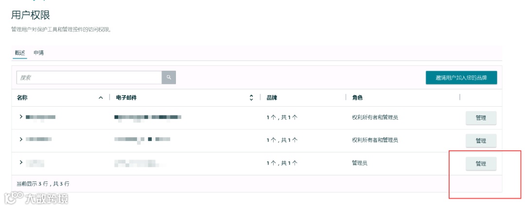 - 在品牌角色列表中找到目标品牌,点击右侧“管理”(Manage)。