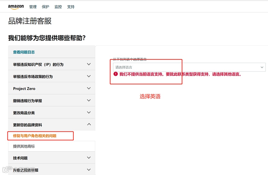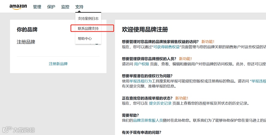 - 访问 https://brandregistry.amazon.com/,点击“联系品牌支持”。