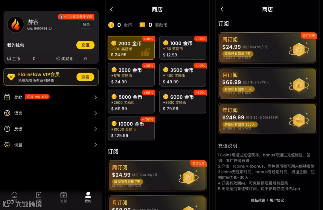 「FlareFlow」主要的收费方式还是通过充值Coins解锁短剧内购或者充值周卡/月卡/年卡的形式来进行收费。