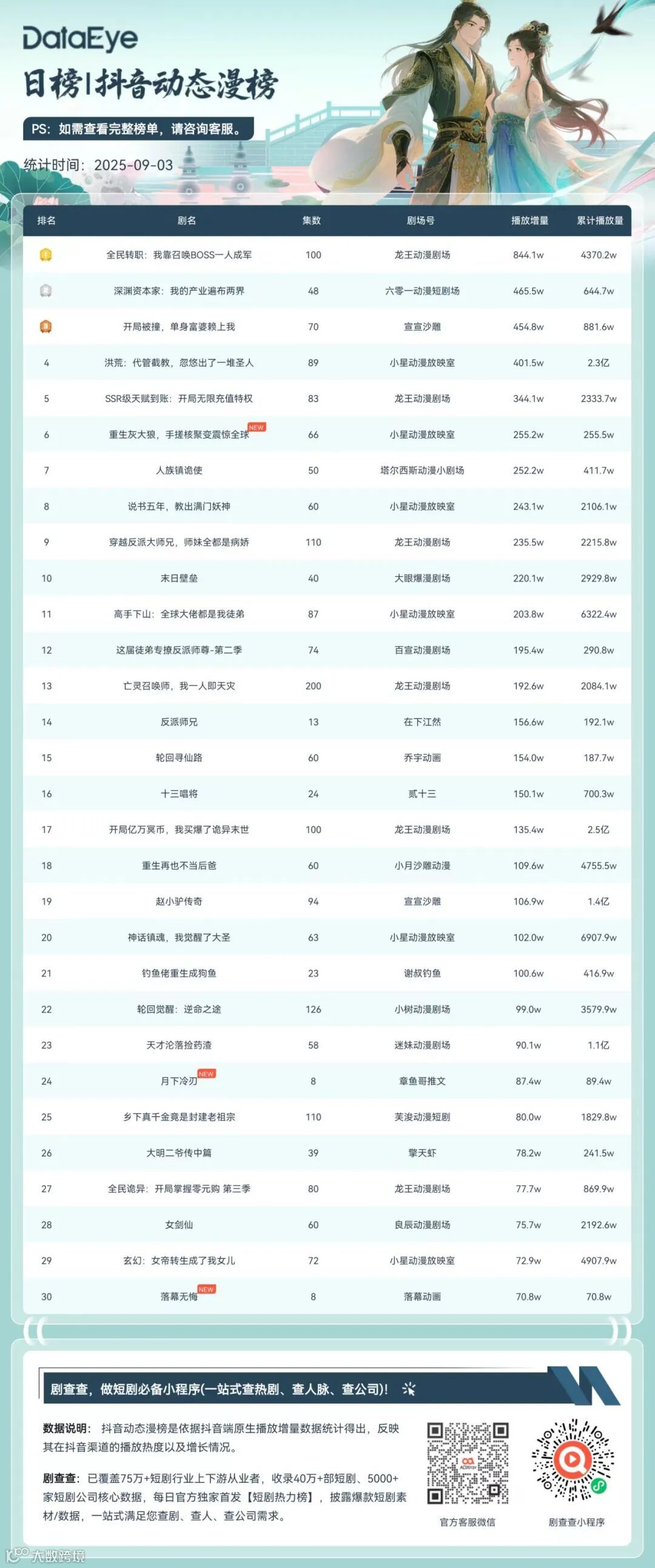 本期(9月3日)DataEye抖音动态漫榜,龙王动漫剧场《全民转职:我靠召唤BOSS一人成军》第一,本期播放增量达844.1W;六零一动漫短剧场《深渊资本家:我的产业遍布两界》第二,播放增量达465.5W;宣宣沙雕《开局被撞,单身富婆赖上我》位列第三,播放增量达454.8W。