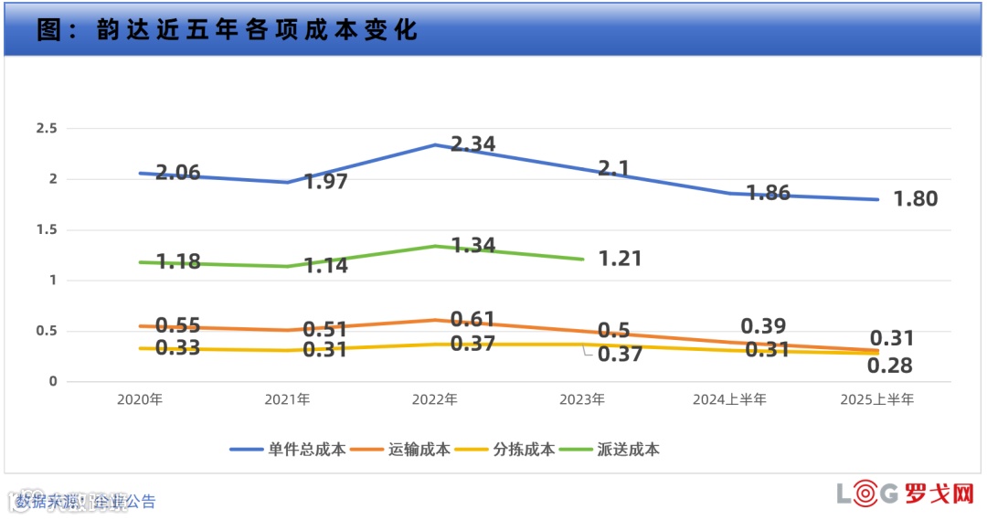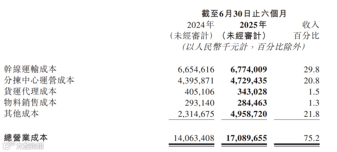 单票营业成本(不含派费)升至0.91元,同比增加0.04元,导致整体毛利率由32%下降至24.8%。尽管运输成本下降0.06元至0.37元,分拣成本下降0.02元至0.26元,但“其他成本”从23.1亿元激增至49.6亿元,增幅114.2%,主要因服务高要求企业客户所致。