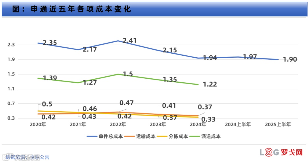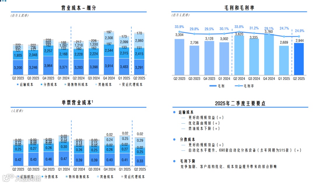 公司已收购丹鸟物流,有望切入落地配与中高端市场,推动品牌升级与资源协同。单票成本降至1.90元,同比下降0.07元,但未披露细分成本数据。受价格战影响,票均收入下降至2.00元,毛利率4.89%,同比下降0.87个百分点,盈利仍承压。