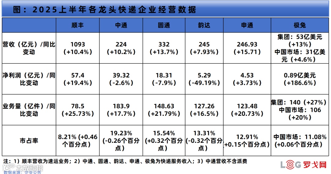 2025年上半年,中国快递行业延续激烈竞争态势,头部企业“通达兔”阵营格局生变,成本优化能力成为决定企业竞争力的核心要素。顺丰增速领先,中通业务量仍居首位但市占率微降,圆通稳居第二,韵达与申通“争三”白热化,极兔在国内外市场持续扩张,中国邮政凭借网络广度稳居第六。