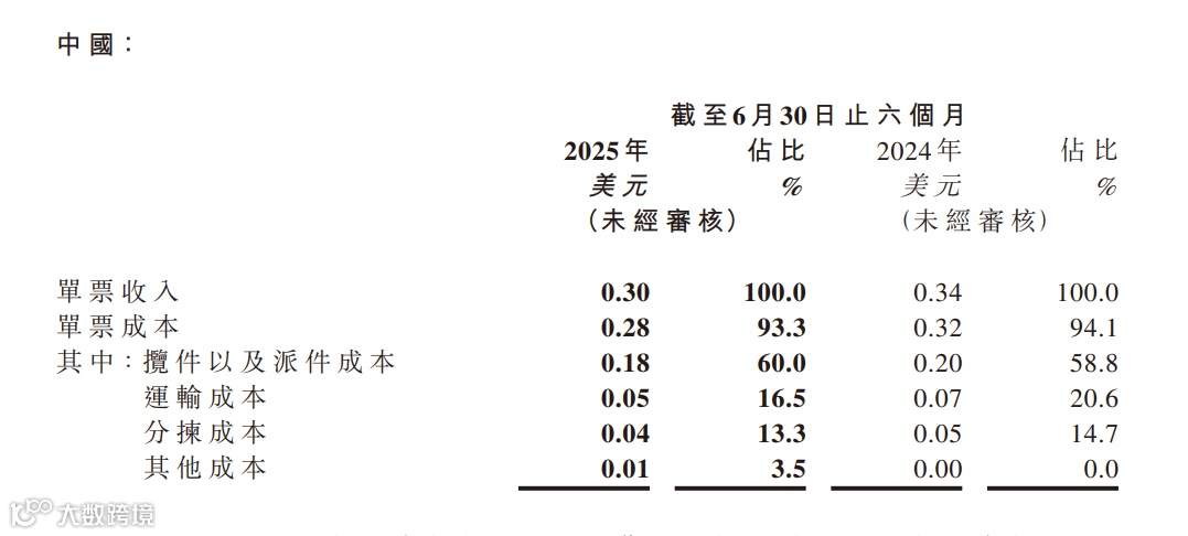 中国市场包裹量达106亿件,同比增长20%,市占率提升至11.08%。单票成本从0.32美元降至0.28美元,降幅12.5%。其中揽派成本降0.02美元,运输成本降0.02美元,分拣成本降0.01美元,三项核心成本全面优化,体现规模效应与精细化运营深化。