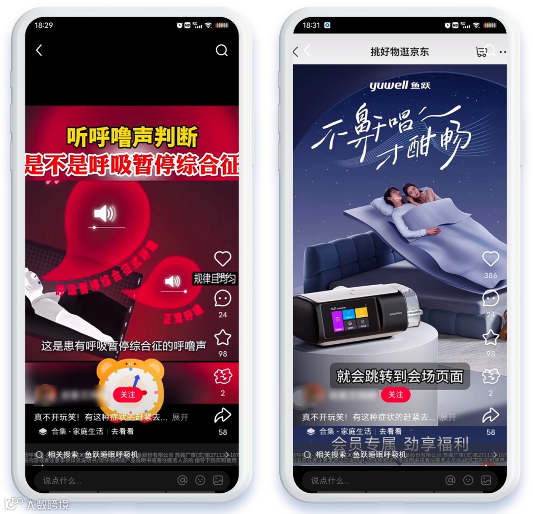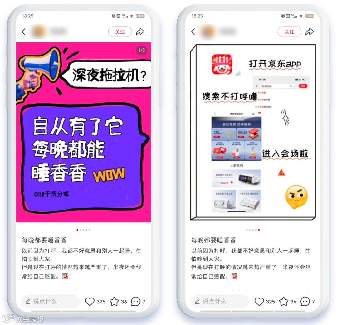 针对医疗器械专业性强的特点,鱼跃医疗联合匹配调性的KOC达人,聚焦家庭使用场景,采用“痛点+解决方案”叙事方式。例如,呼吸机推广中,达人通过“没想到幸福感还能睡出来”等体验式笔记,分享改善打鼾的真实经历,结合夜间使用图与APP数据截图,突出产品智能、静音、舒适等优势,并引导用户搜索【不打呼噜】直达京东品牌专区,形成内容到行动的闭环。