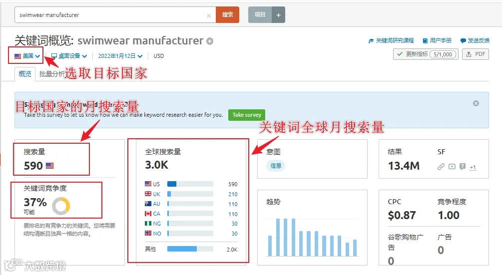 但需注意:不同地区搜索结果存在差异。建议使用SEMRUSH等工具,按目标市场(如美国、英国、法国、德国)查看关键词搜索结果,获取更精准的本地化排名数据。SEMRUSH还能提供月访问量、关键词数量、外链数等关键指标,便于筛选前20名优质站点进行深度分析。