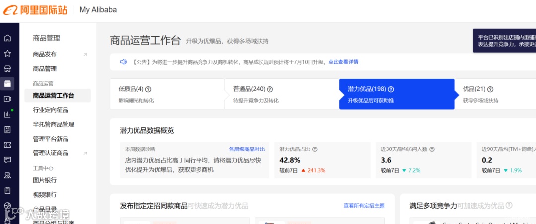 比如30天以上零效果产品,应当及时去调整优化,通过调整产品标题、副标题和关键词,或者将产品加入到推广引流计划中,让产品及时获得曝光成为潜力优品甚至优品