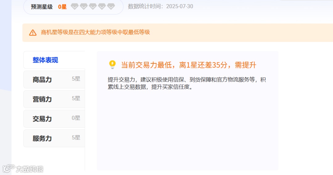 店铺星级包含商品力、营销力、交易力、服务力等版块,通常来讲,营销力和交易力是店铺升星比较欠缺的关键版块,建议每周查看,然后针对性进行运营调整,补足短板。