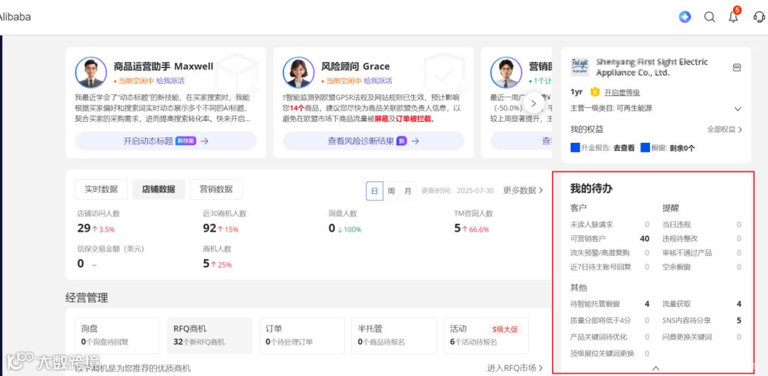 那么作为运营,每天登录店铺后台,第一眼就是查看我的待办,因为这里平台已经给出店铺优先待办事项,尤其是出现违规或者违规待整改等等,需要第一时间去处理和解决;另外如果有可营销的客户或没有回复的询盘,运营要及时提醒业务进行跟踪处理!