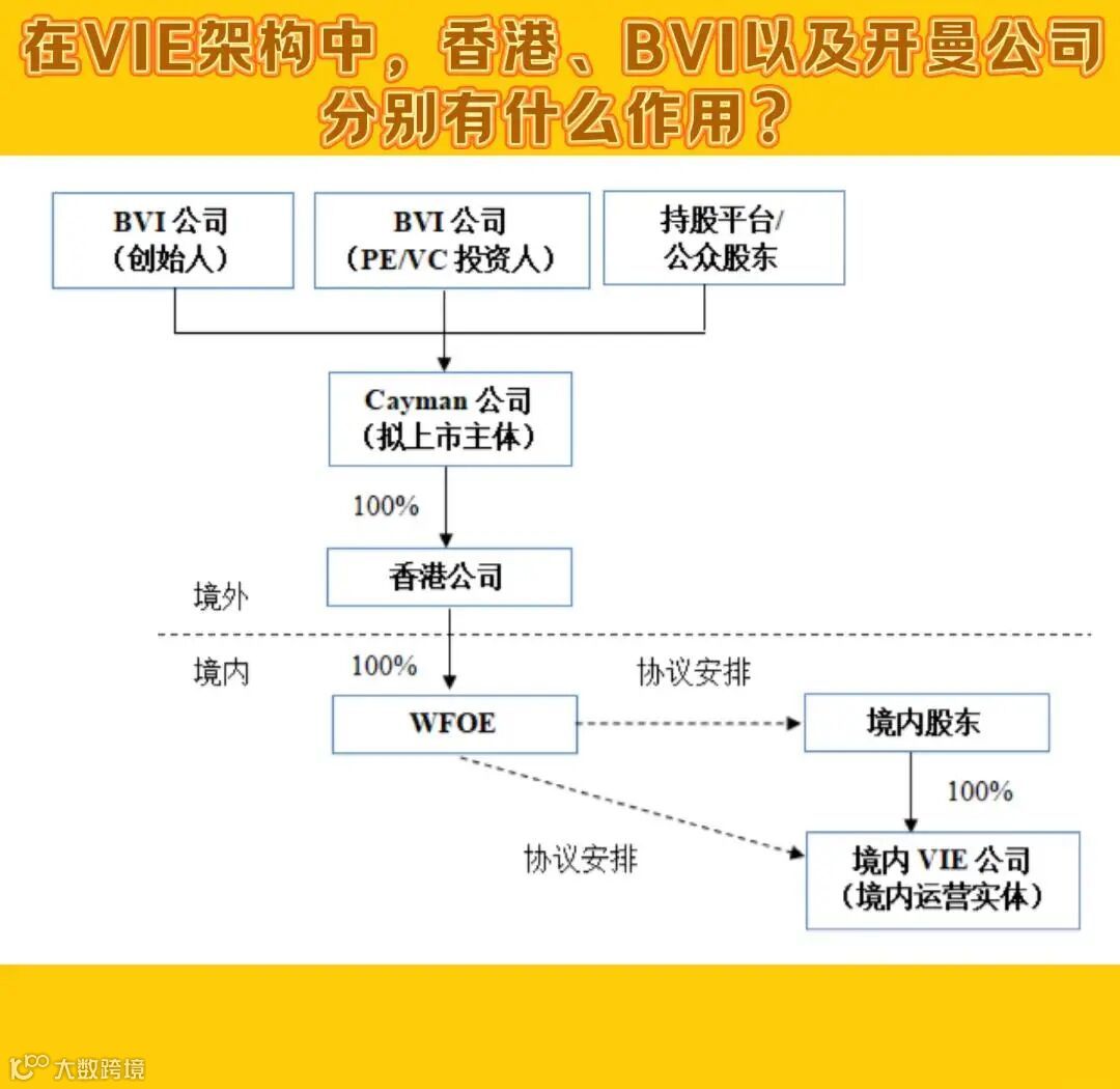 ✅股权控制链: 中国创始人/管理团队 → 设立BVI公司 (隐私、税务) → 控股开曼上市主体 (ListCo)。