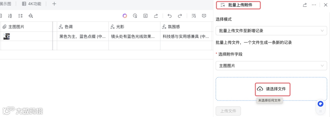 将合并后的图片文件夹批量上传至飞书多维表格,即可开展卖点识别、视觉呈现等深度分析。