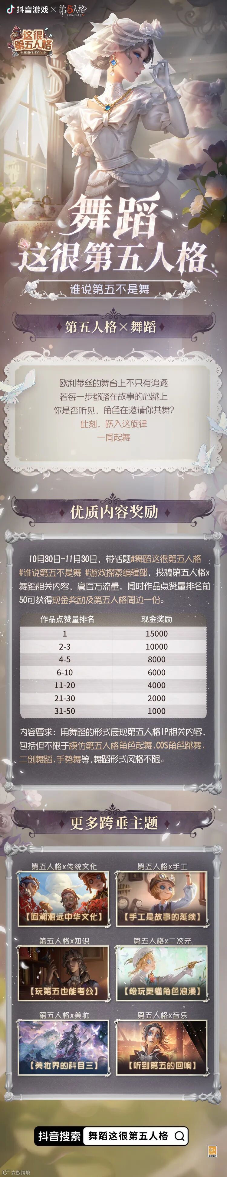 发布《第五人格》相关舞蹈内容即可参与活动!芭蕾、爵士、街舞、手势舞......无论你是复刻角色的标志动作,还是用即兴舞姿诠释心中的庄园故事,此刻的舞台,为你而亮!