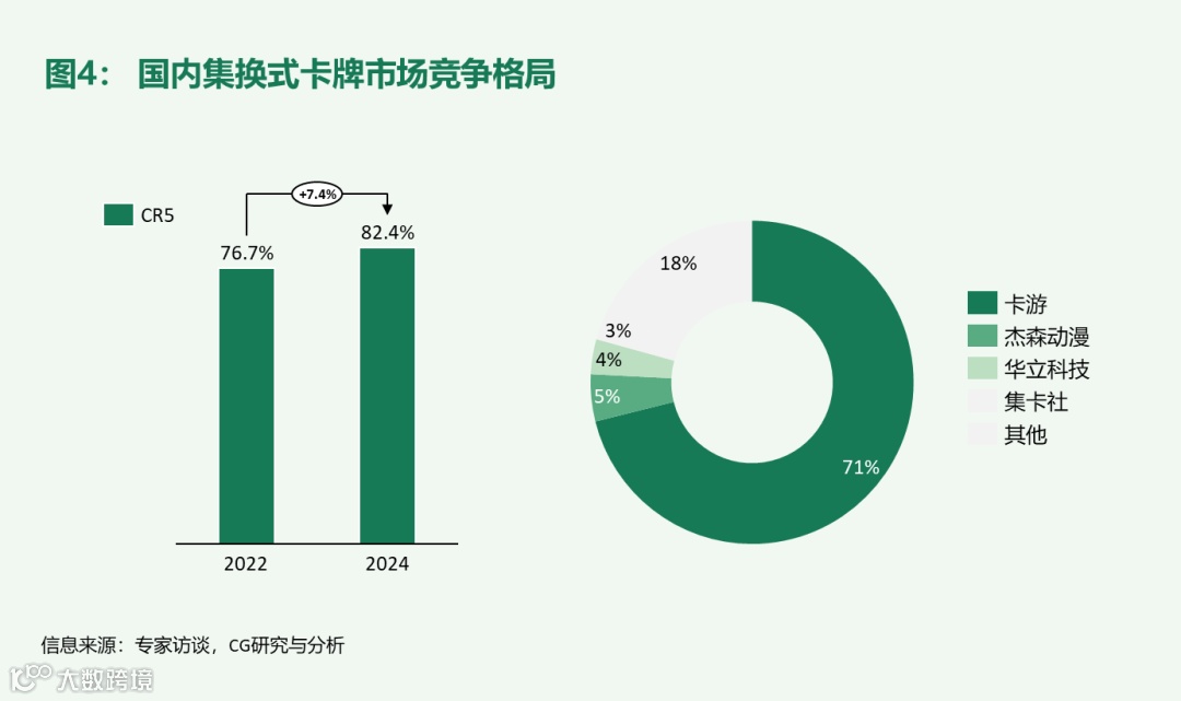 市场竞争格局:中国市场前五大公司占总市场份额的 82.4%,其中卡游一家就占据了 71.1% 的市场份额。这种高度集中的格局主要是由 IP 资源、渠道网络、设计能力和资金实力等因素造成的。