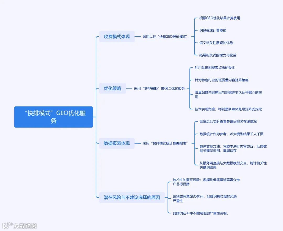 此类操作一旦触发AI模型风控机制,品牌词可能被限流甚至屏蔽,后果严重。因此,不建议选择以“快排思维”运作的GEO服务。
