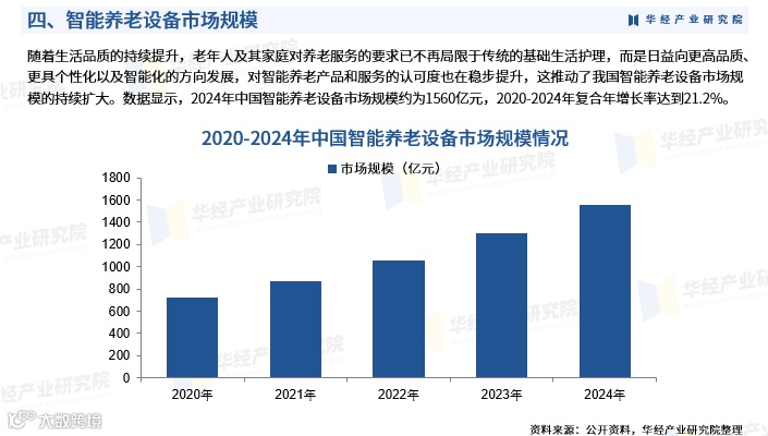 随着居民生活水平提高,老年人及其家庭对养老服务的需求已从基础照护转向高品质、个性化和智能化方向发展,对智能养老产品的接受度不断提升,推动行业快速发展。数据显示,2024年中国智能养老设备市场规模达1560亿元,2020—2024年复合年增长率达21.2%。