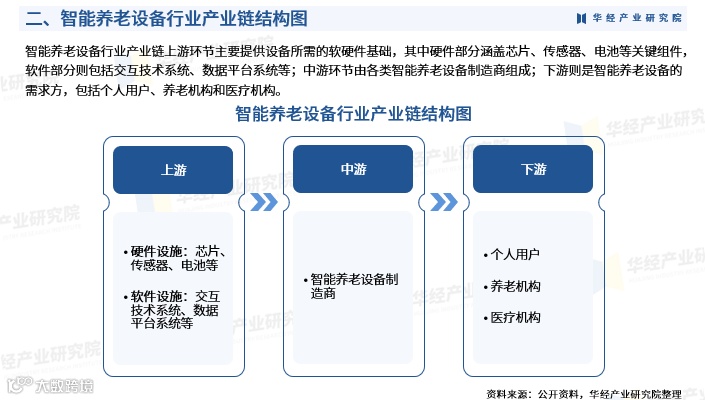 行业产业链上游涵盖芯片、传感器、电池等核心硬件及交互系统、数据平台等软件支撑;中游为智能养老设备制造企业;下游主要面向个人用户、养老机构和医疗机构等需求方。