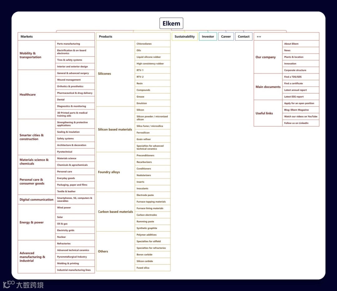 Elkem的核心策略不是“营销自己”,而是“教客户懂材料”。从硅胶微粉到高性能碳素,每个产品均对应明确应用场景,构建“材料-应用-客户”的闭环结构,精准匹配B端决策链。