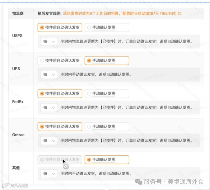商家在发布商品时,仅当选择【其他】类型仓库,方可选择“9个工作日内发货”的承诺时效,生成Y2模式商品。始发地址填写美国清关行或中转仓地址,由头程服务商提供。
