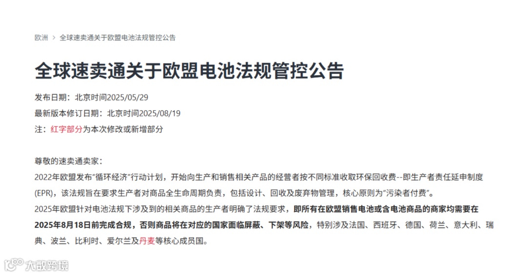近日,速卖通平台更新了欧盟电池法规管控公告,将丹麦纳入管控范围。自 2025 年 8 月 18 日起,欧盟电池法(EPR)已强制生效,这意味着在速卖通上向丹麦销售电池或含电池商品的商家,都必须完成合规,否则商品将面临屏蔽、下架等风险。