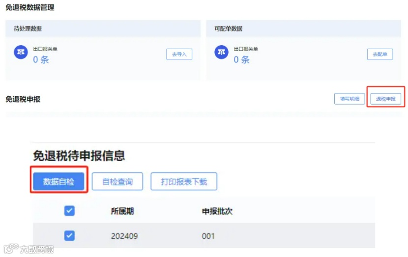 填写申报数据后,点击“退税申报”,进行数据自检。待自检结果显示“错误类疑点为0”时,方可提交正式申报。