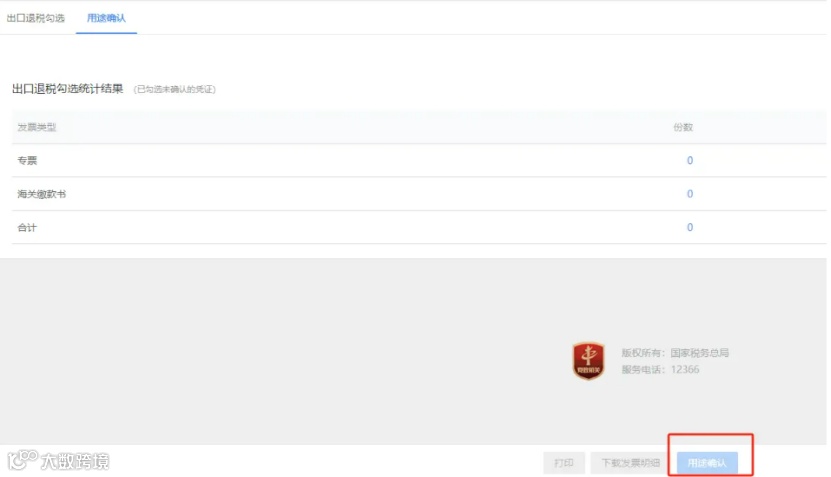 务必选择“退税专用勾选”并完成确认,否则可能导致无法退税。