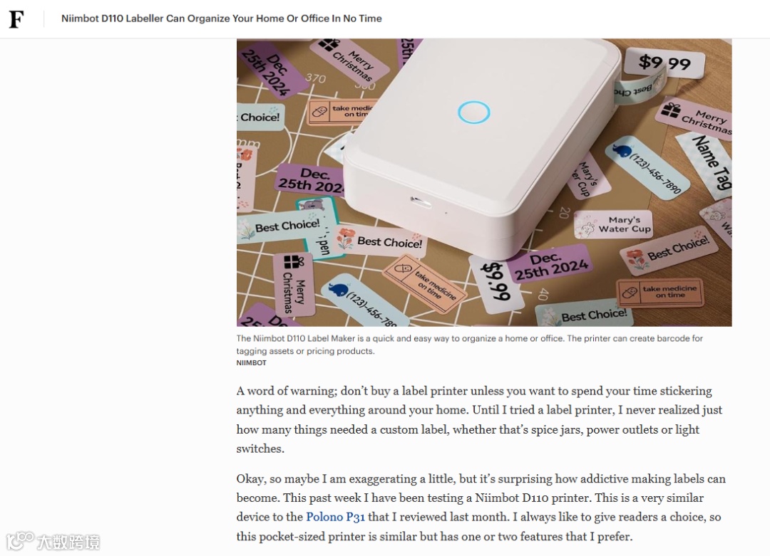 品牌注重塑造专业形象而非单纯促销。2024年,NIIMBOT D110机型获Forbes专题报道,通过真实场景演示解决用户痛点,显著提升品牌知名度与信任度。