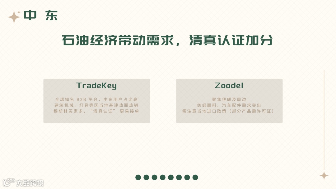 依托石油经济,中东对建筑建材、工业设备及奢侈品需求强劲,具备相关认证产品更具竞争力。