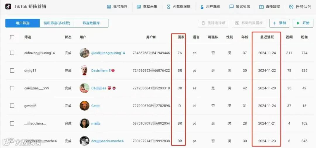 ● 智能数据清洗:支持按国家、语言、年龄、性别、活跃度等多维度筛选,确保目标用户高度精准,提升后续转化效率。