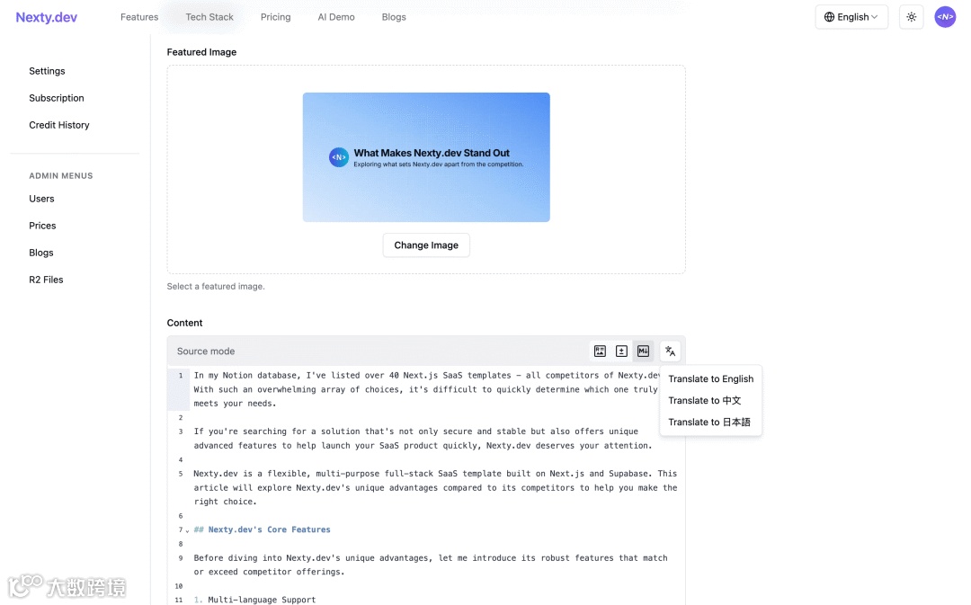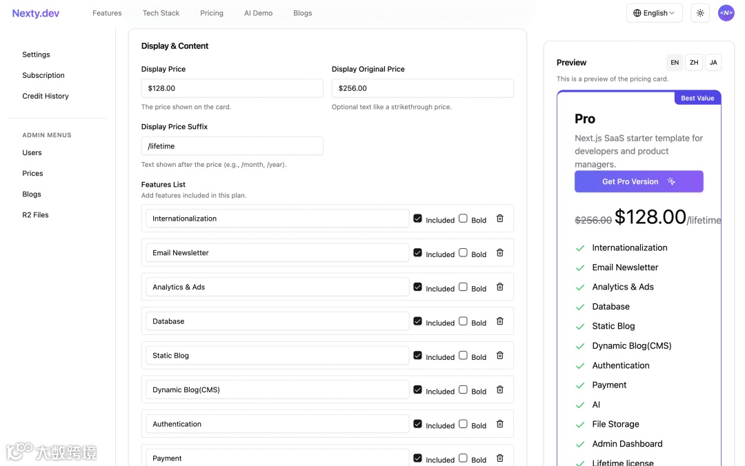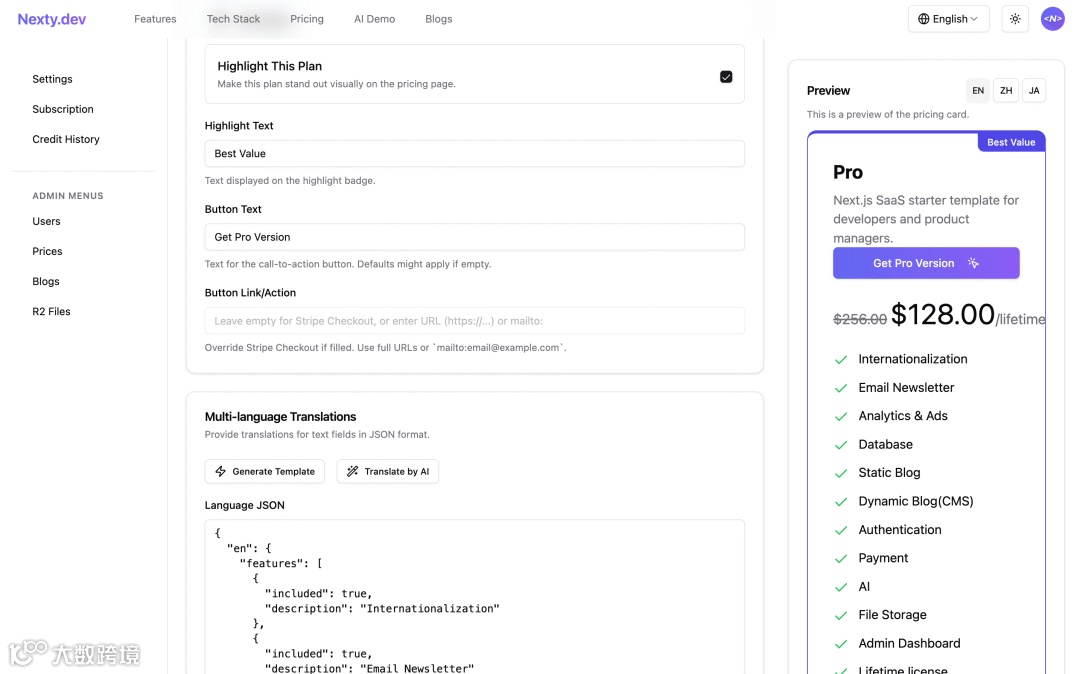 这是 Nexty 最让我印象深刻的功能。与其他模板使用复杂 JSON 配置不同,Nexty 提供了完全可视化的定价管理界面。轻松管理定价、自动与 Stripe 同步,并支持多语言——所有这些都通过直观的界面实现,这是其他模板无法提供的。