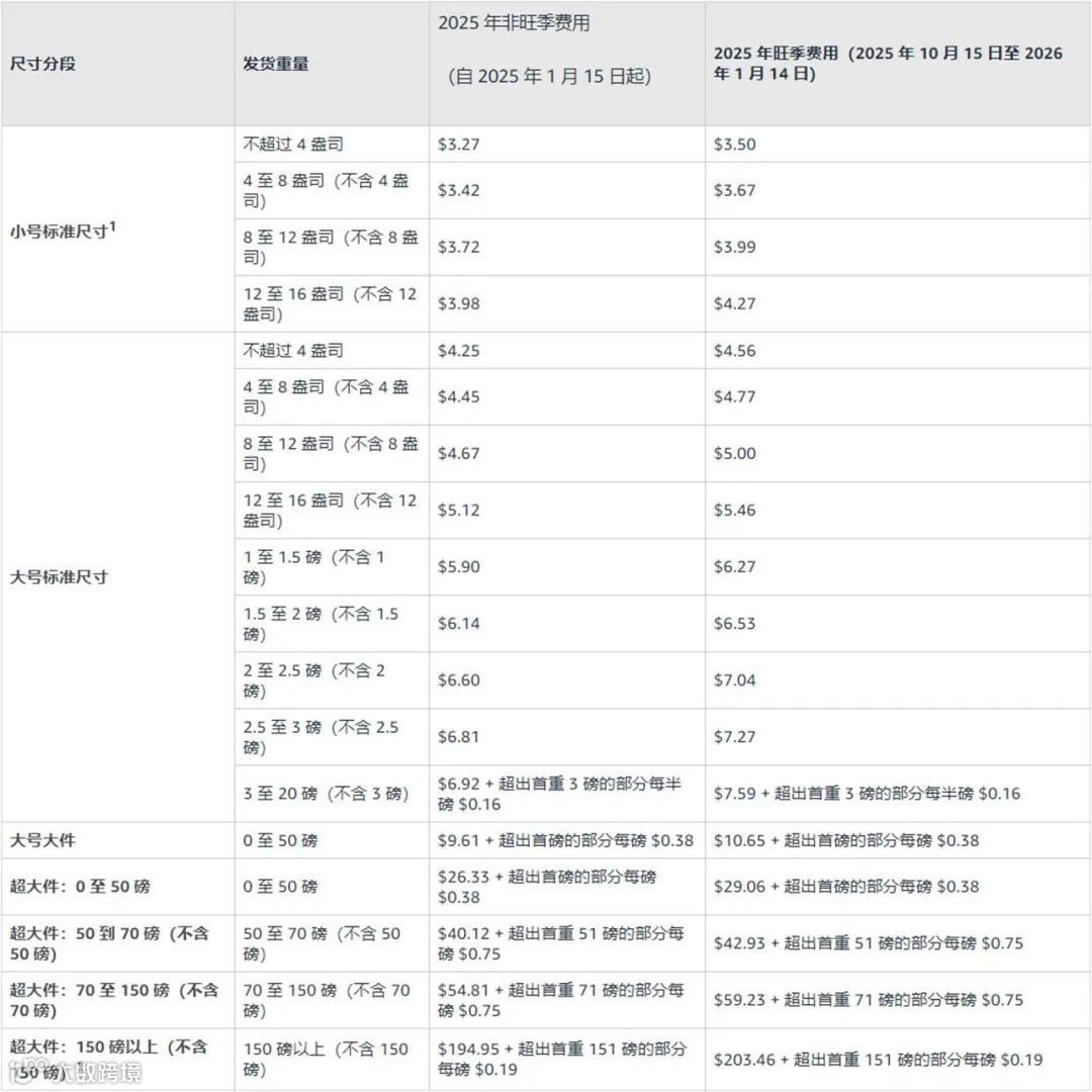 需注意,只要卖家在10月15日之后发货,无论消费者下单时间,订单均自动叠加旺季附加费。整体来看,商品尺寸越大,涨幅越显著,其中大号大件(0–50磅)及更大商品的旺季配送费较平时高出1–20美元不等。