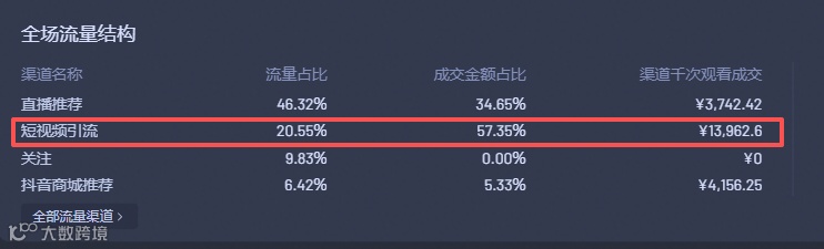 分析发现,大量成交用户来自短视频引流,其GPM仅次于直播推荐,显著高于行业均值。这表明:通过短视频进入直播间的用户人群精准、目的明确、转化意向强,得益于内容与产品的高度相关性,实现了有效筛选。
