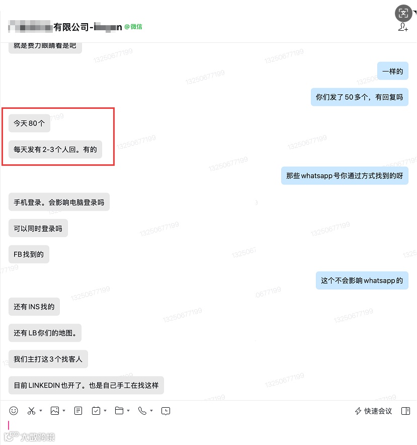 该类企业利用“LBS地图搜索”功能,快速获取目标国家和地区多达100个城市的实地商家信息,包括联系方式、地址等关键数据。随后通过“WhatsApp拓客”功能,向潜在客户批量发送产品信息,半个月内收获近30个高质量询盘。