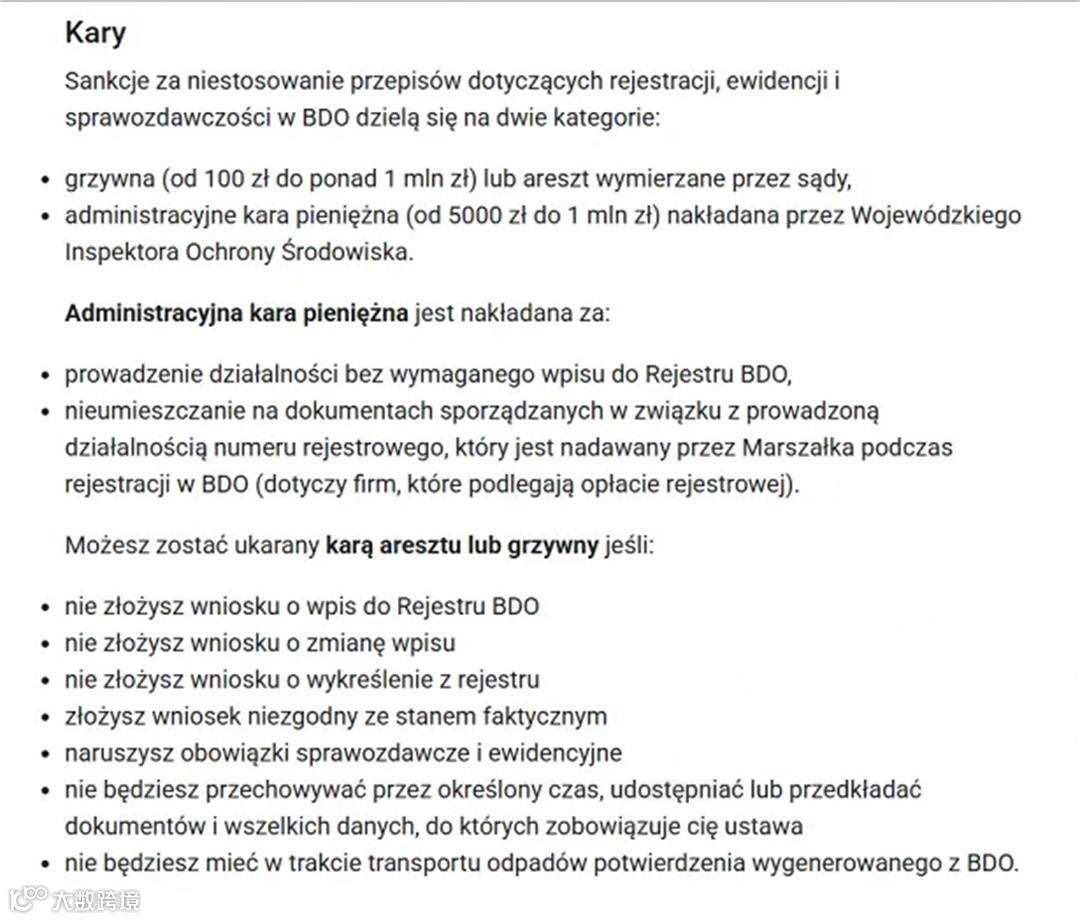 - 已持有电池法注册号但未注册包装法,可能面临高达100万兹罗提(约198万人民币)的行政罚款。
