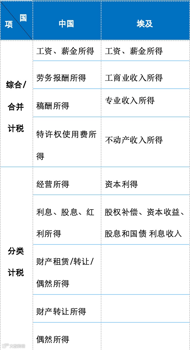 埃及将工商业及专业服务收入纳入综合计税,而中国将此类收入列为“经营所得”单独计税,体现两国在分类与综合税制上的不同取向。