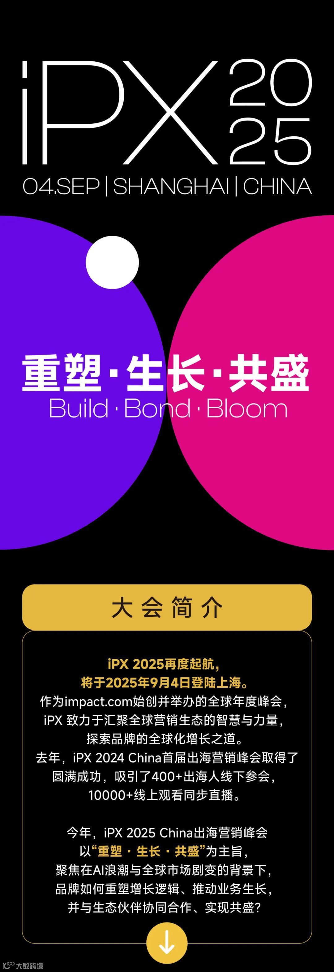 iPX(Partnerships Experience)是impact.com发起的全球年度峰会,致力于汇聚全球营销生态智慧,探索品牌全球化增长路径。继2024年首届iPX China出海营销峰会成功吸引超400位从业者线下参与、逾万人线上观看后,iPX 2025 China将于2025年9月4日在上海再度启幕。