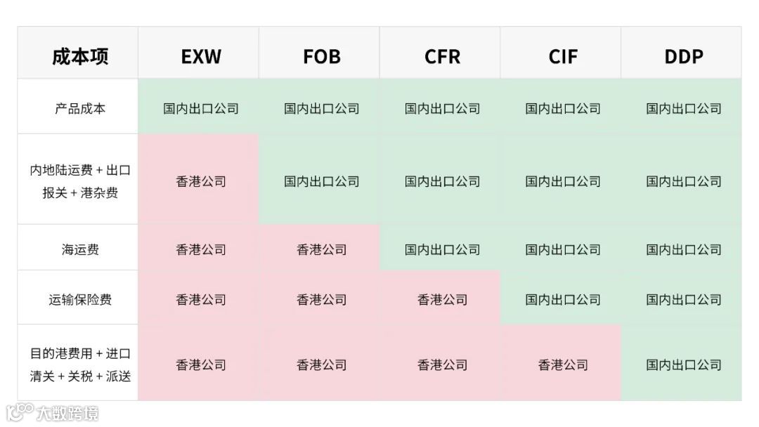 - 出口清关责任:FOB、CFR、CIF由国内公司负责;EXW由香港公司负责。