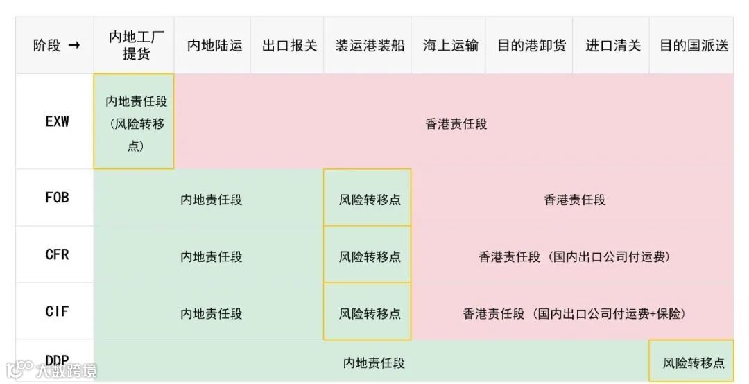 流程图清晰展示各方式下责任分界:绿色为国内公司责任段,红色为香港公司责任段,黄色框为风险转移点。