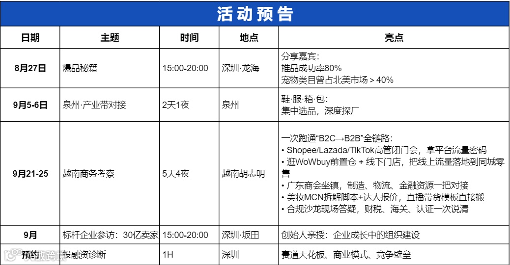 目标人群:实力跨境电商卖家、具备制造能力的工贸一体工厂主、专注跨境电商领域的专业投资人