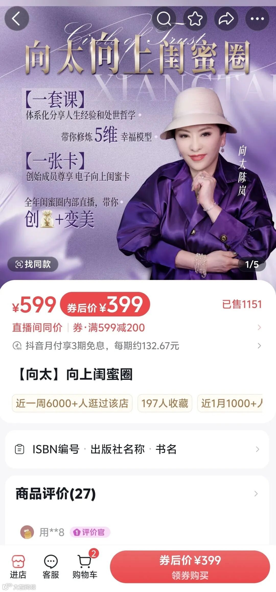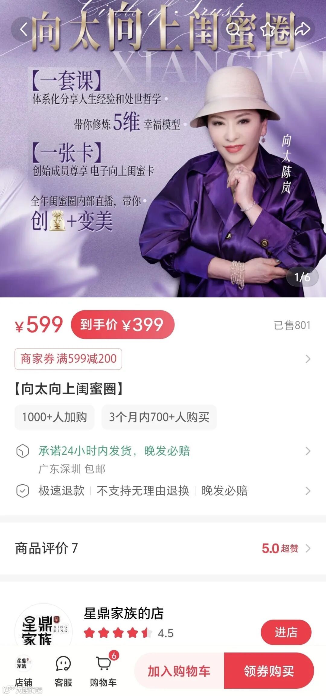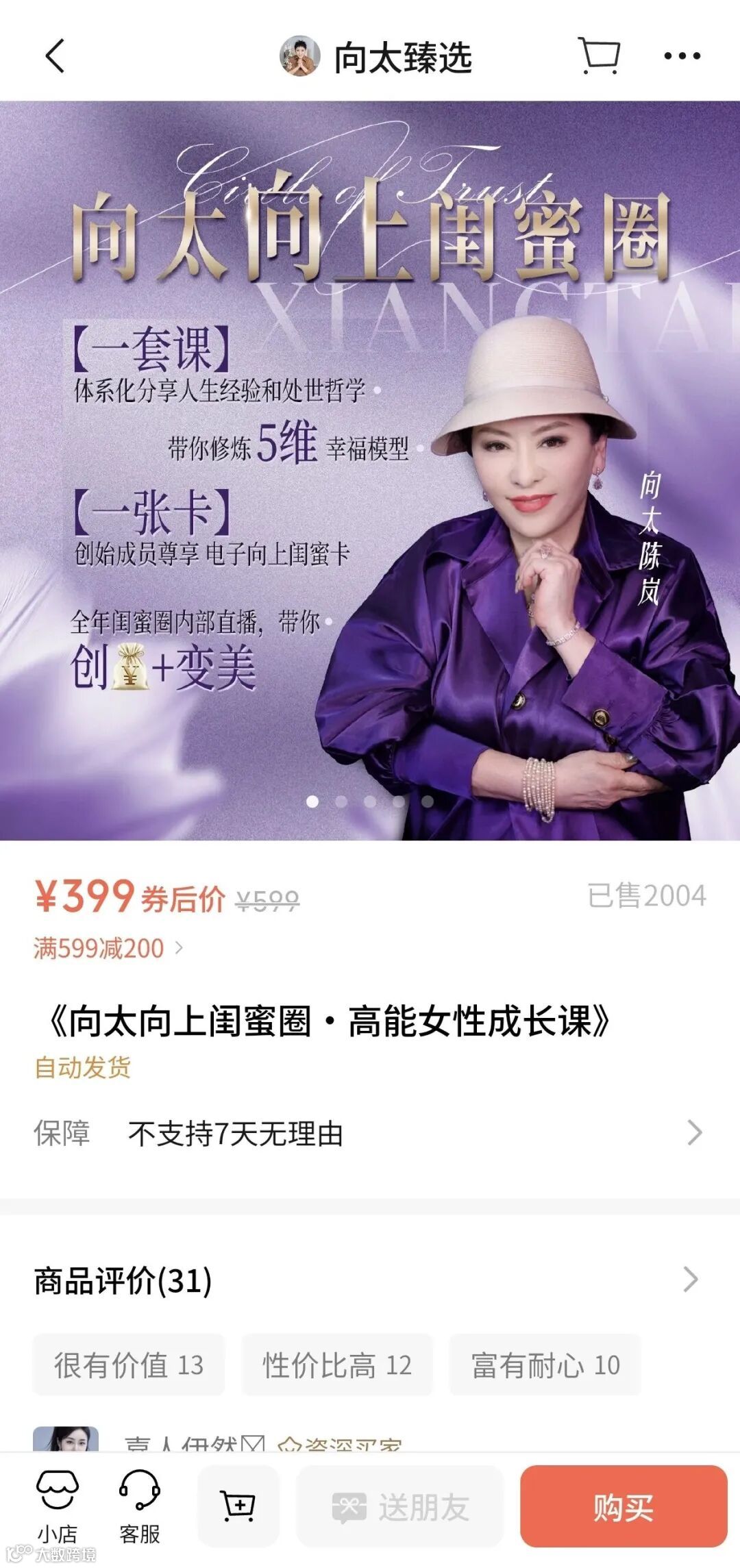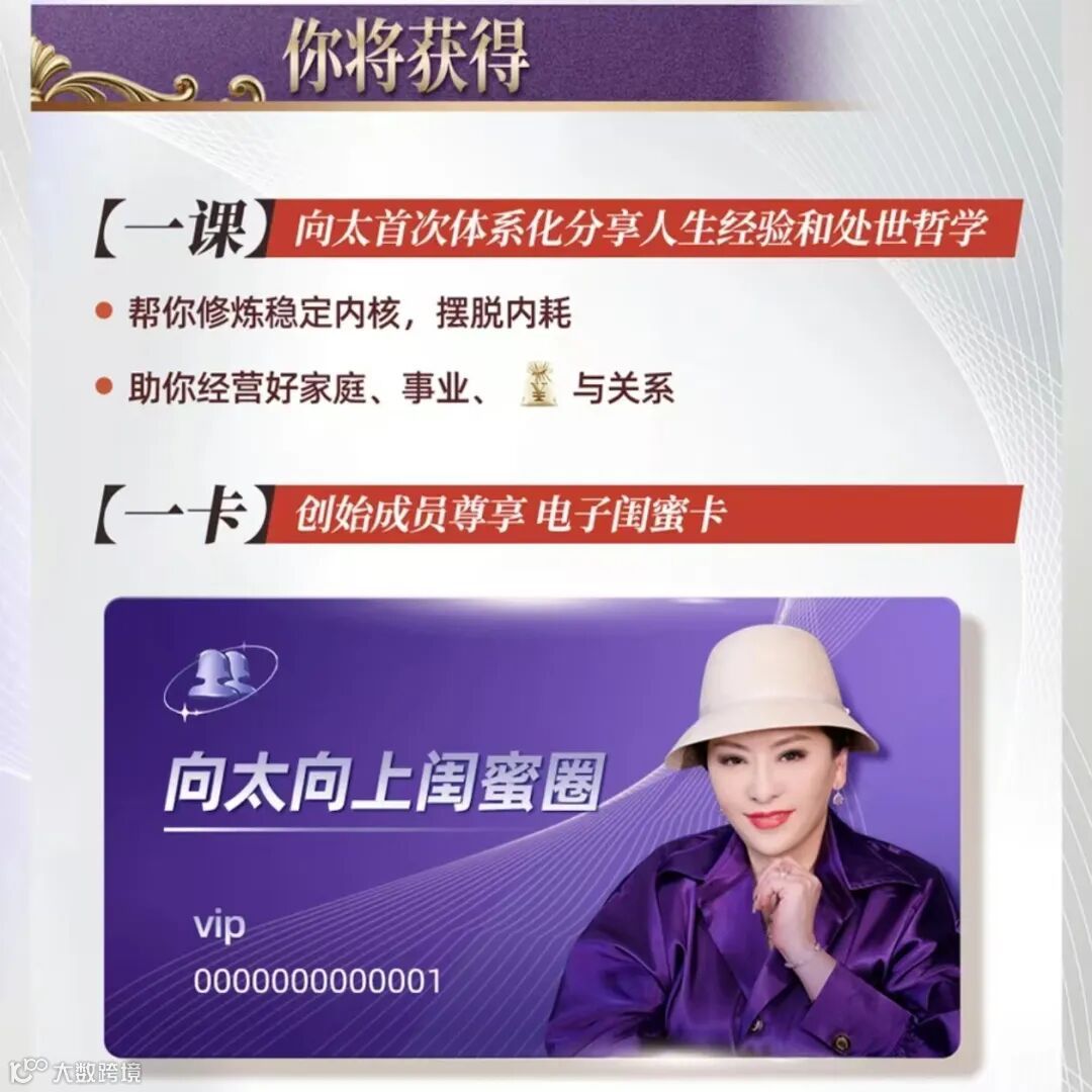 近期,向太推出知识付费课程《向太向上闺蜜圈》,原价599元,券后399元。课程包含录播课与不定期内部直播,购买者还可获得“创始成员尊享电子闺蜜卡”,享有专属编号及全年闭门活动权益,但需下单后立即激活,逾期失效。