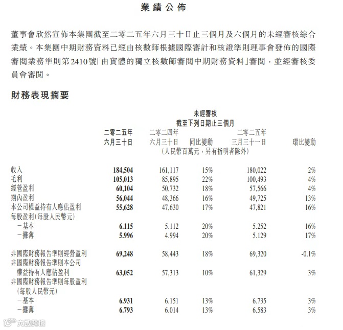 腾讯发布2025年第二季度财报,展现强劲增长势头。当季实现营收1845.04亿元,同比增长15%,环比增长2%;非国际财务报告准则(Non-IFRS)经营利润达692.5亿元,同比增长18%。